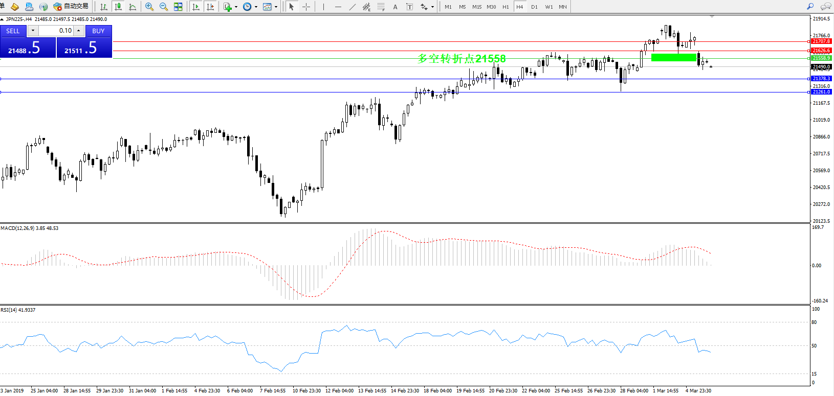 技术点评:高位遇阻回撤,多头动力衰竭,空头伺机入场,MACD指标0轴附近徘徊,RSI指标进入空头区域继续下行;