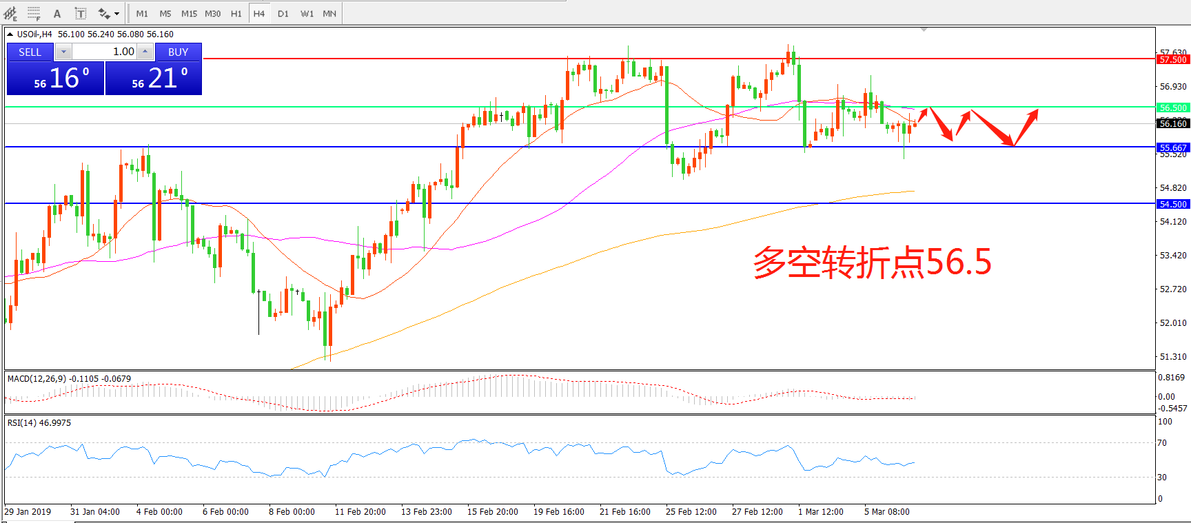 4小时图看,油价呈现窄幅震荡走势,上方均线逐渐粘合形成的阻力,下方55.6一线支撑依然有效,MACD红柱减少,RSI指标拐头,日内有小幅反弹可能。