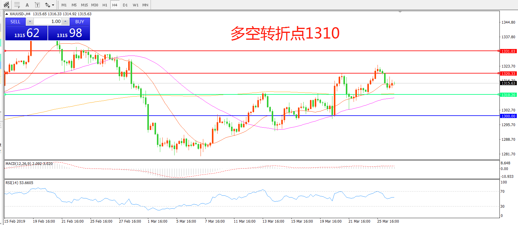 4小时图看,金价回踩1310支撑后暂时企稳,下方支撑点逐渐上移,整体走势偏多,均线系统呈多头排列,MACD走平,短期依然有回调可能,但中长期以逢低做多思路为主。