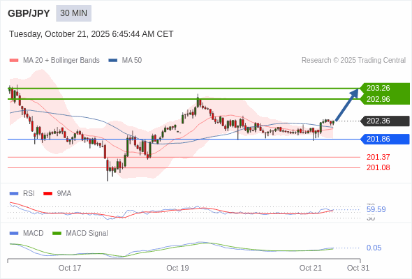 英镑/日元 当日内 : 看涨,当 201.86 为支撑位。