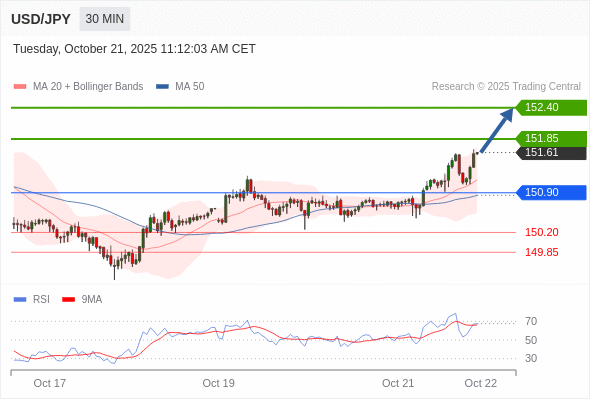在 150.90 之上,看涨,目标价位为 151.85 ,然后为 152.40 。