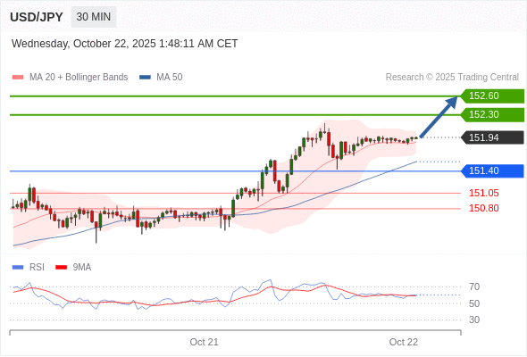 在 151.40 之上,看涨,目标价位为 152.30 ,然后为 152.60 。