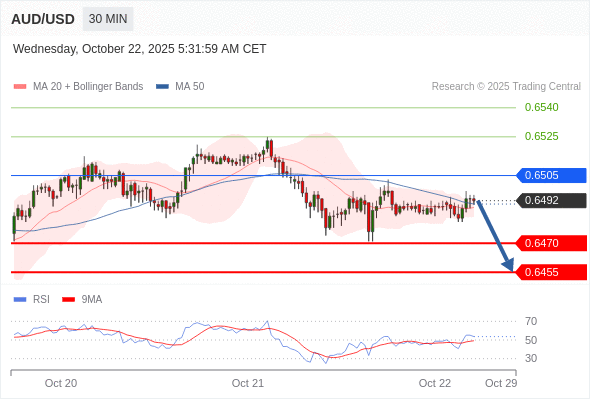 在 0.6505 之下,看跌,目标价位为 0.6470 ,然后为 0.6455 。