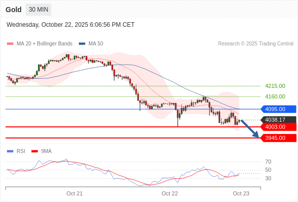 在 4095.00 之下,看跌,目标价位为 4003.00 ,然后为 3945.00 。