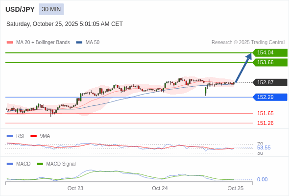 美元/日元 当日内 : 看涨,当 152.29 为支撑位,目标定在154.04。