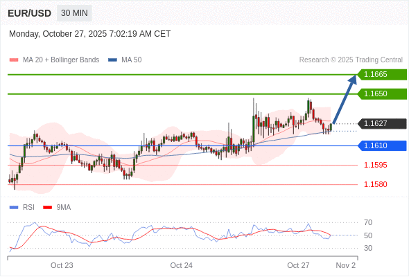 在 1.1610 之上,看涨,目标价位为 1.1650 ,然后为 1.1665 。