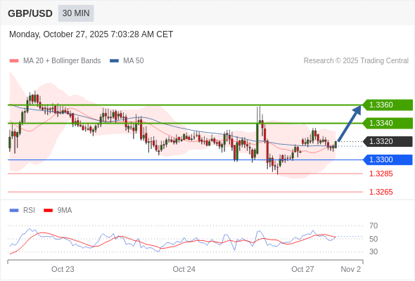 英镑/美元 当日内: 在1.3300之上,看涨。