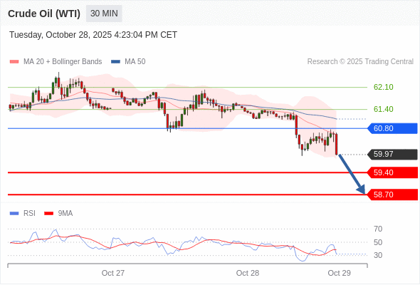 在 60.80 之下,看跌,目标价位为 59.40 ,然后为 58.70 。