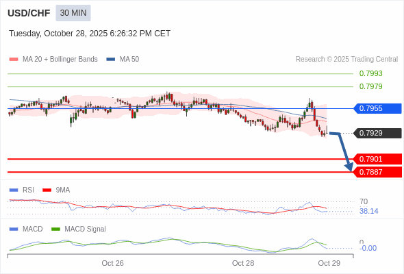 美元/瑞郎 当日内 : 看跌,在 0.7955 之下。