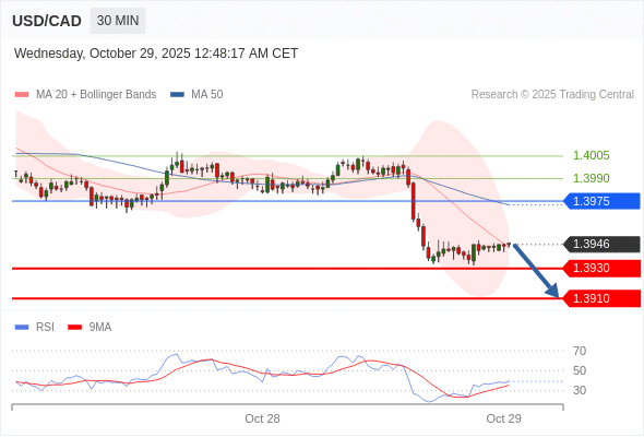 在 1.3975 之下,看跌,目标价位为 1.3930 ,然后为 1.3910 。