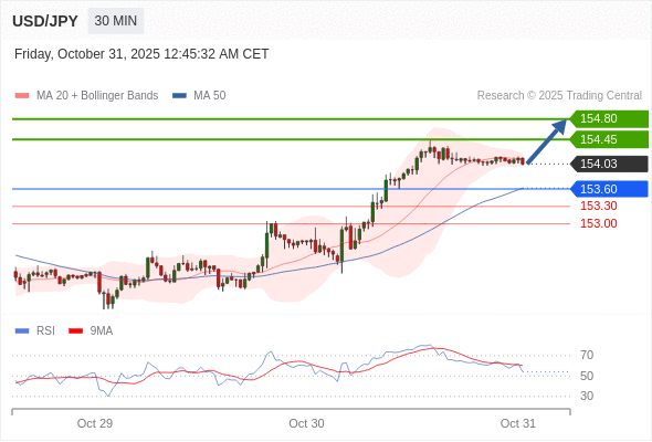 在 153.60 之上,看涨,目标价位为 154.45 ,然后为 154.80 。