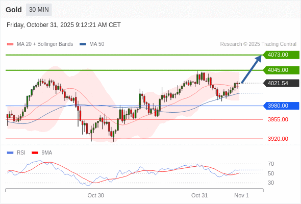 在 3980.00 之上,看涨,目标价位为 4045.00 ,然后为 4073.00 。