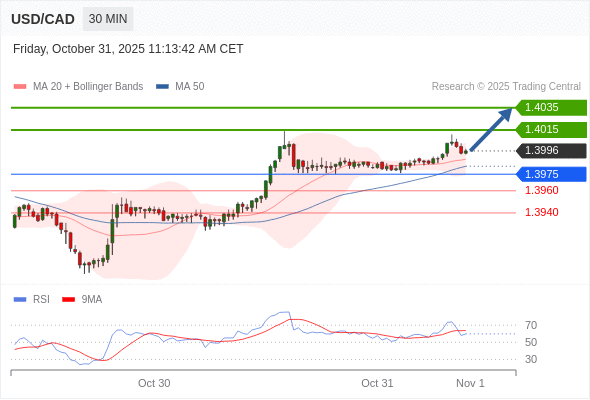 在 1.3975 之上,看涨,目标价位为 1.4015 ,然后为 1.4035 。