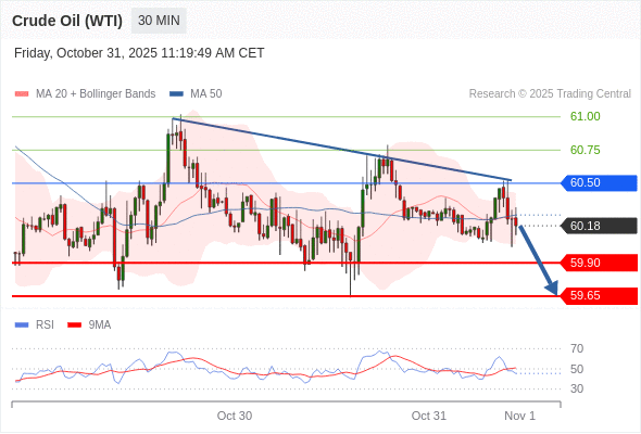 在 60.50 之下,看跌,目标价位为 59.90 ,然后为 59.65 。