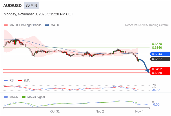 澳元/美元 当日内 : 看跌,在 0.6544 之下。