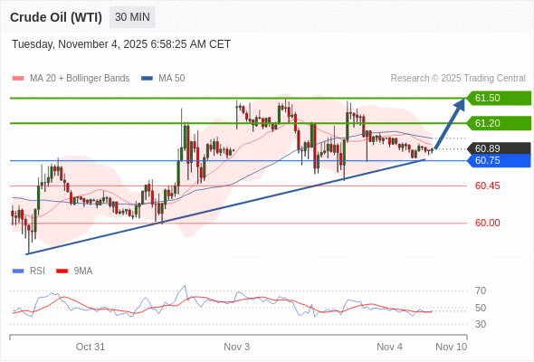 在 60.75 之上,看涨,目标价位为 61.20 ,然后为 61.50 。