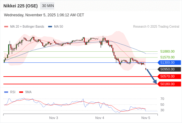 在 51300.00 之下,看跌,目标价位为 50570.00 ,然后为 50180.00 。