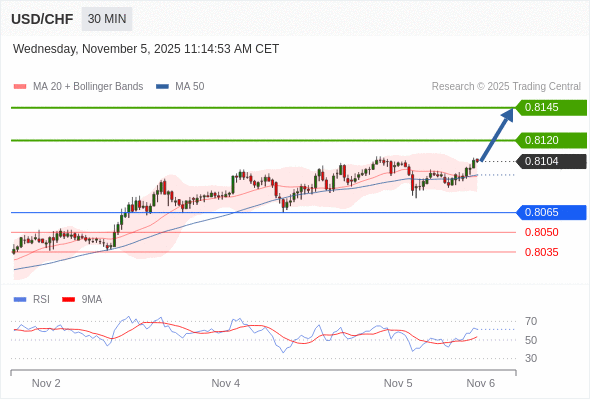 在 0.8065 之上,看涨,目标价位为 0.8120 ,然后为 0.8145 。