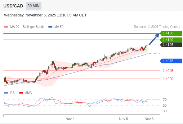 在 1.4075 之上,看涨,目标价位为 1.4140 ,然后为 1.4160 。