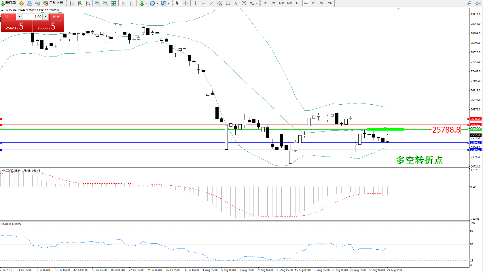 香港恒生指数8月29日(周四)收盘上涨88.02点,涨幅0.34%,报25703.50点;近日从各地之数据中显示,目前全球经济持续向下,更未见触低反弹。国内外之订单皆大幅下降。德国 PMI 更低见43.8。可见全球贸易跌幅比2012年还要差。连同美国债券息率日创新低,孳息率倒挂差距之幅度,也创出历史底位。此刻,相信在任何投资上,都要谨慎和保守。港股昨日高开后随即回落,其后于25,600-25,700点水平上落。多重因素继续困扰投资气氛。面对如此胶着状况,相信大市仍会呈窄幅上落,并于25500点水平拉锯。不过基于投资者关注内地经济以及未来净息差表现,股价实在难有憧憬,故建议继续观望为上。