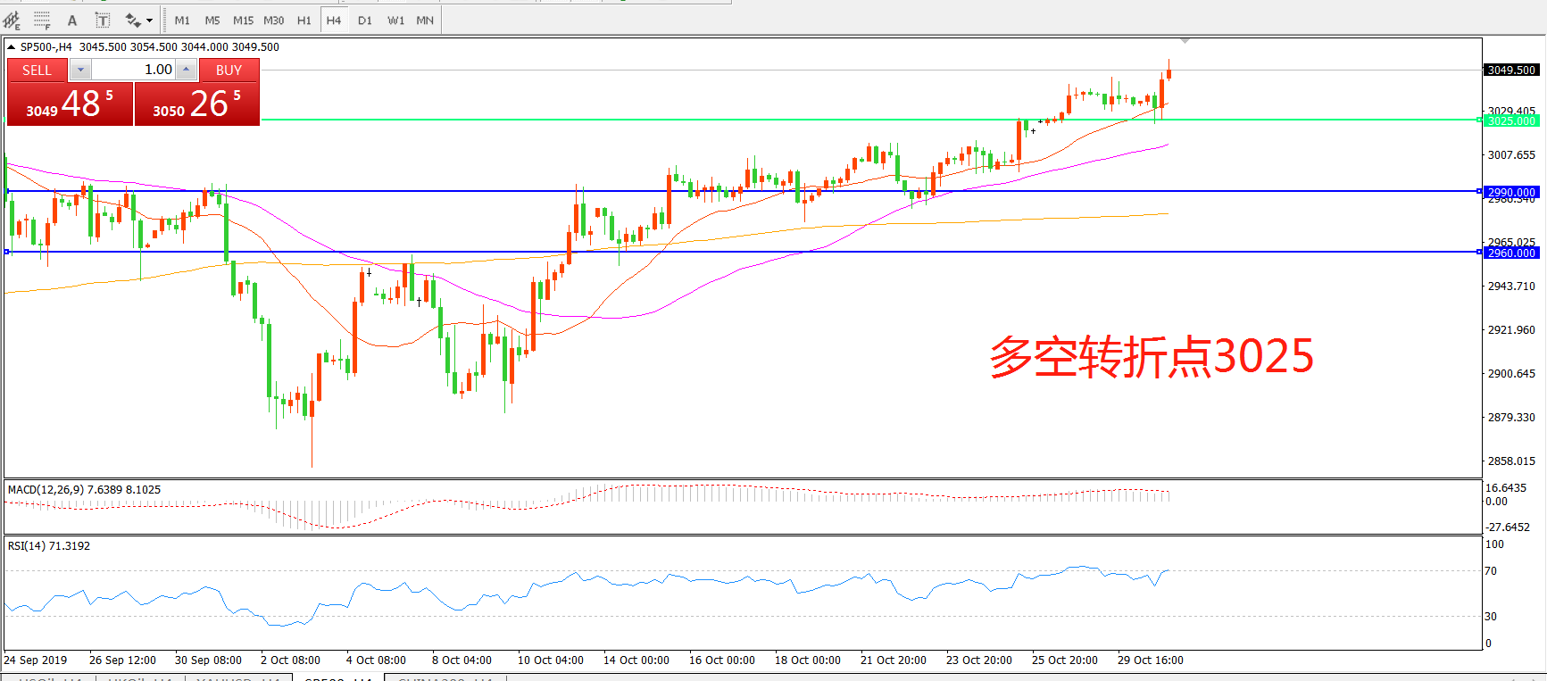 4小时图看,标普500站稳3025支撑后强势反弹,整体走势偏强,均线系统呈多头排列,MACD红柱减少,RSI指标走平,日内延续上行概率较大。