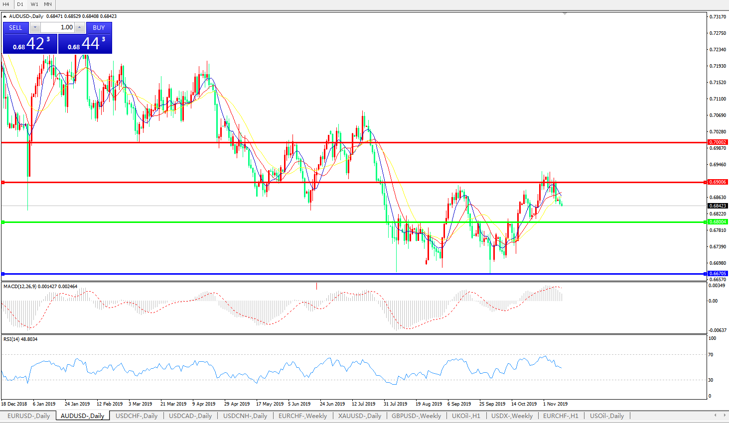 澳元兑美元在周一亚洲时段始终陷于低位盘整,创下自1029日以来近两周新低0.6848,因此前带动商品系货币走强的贸易利好消息影响进一步退潮,投资者转而对经济领域的需求状况再生顾虑,这令澳元汇价首当其冲;虽然澳洲联储上周二的政策决议措辞曾助推澳元创出新高,但之后在周五公布的会议纪要却又透露了近乎截然相反的措辞,这令行情出现见顶回落。而投资者更担心的则是澳洲本国及其贸易伙伴的经济基本面。周末澳洲最大贸易伙伴中国发布的PP数据仍深陷负区间,显示对工业原材料产品需求受限,这对于澳元走势是最直接的冲击; 这也意味着澳元仍然陷于筑底过程中,未能完成破位上行的最终进程程,上方200日均线压力依然强大,日内低点处的100日均线成为短线争夺目标。在国际贸易新协议最终白纸黑字落定之前,市场谨慎情绪仍将阻止澳元汇价过快上行
