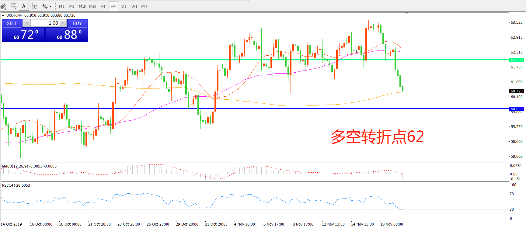 周二(11月19日),有消息传出,俄罗斯方面似乎不太愿意支持扩大减产,但愿意维持延长减产的决定,而根据当前统计,俄罗斯11月产量已经增加至1125万桶/日,再次未能达到减产承诺。油价受此影响,大幅下挫,布伦特原油周二收跌2.5%,报60.71美元/桶。11月20日凌晨,API数据公布,美国当周API原油库存增加595万桶,远高于106.2万桶,汽油库存同步增加,利空油价,若晚间EIA数据证实库存的上升,则将是美国原油库存连续第四周录得增长,有可能引发市场再度抛售,务必重点关注。