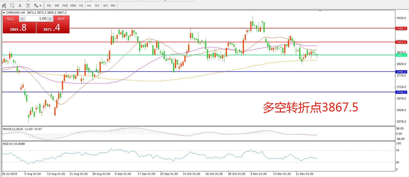 4小时图看,沪深300延续低位震荡,200周期均线成为短期支撑,中期均线成为上方阻力,MACD红柱增加,RSI指标向下,日内维持震荡概率较大。