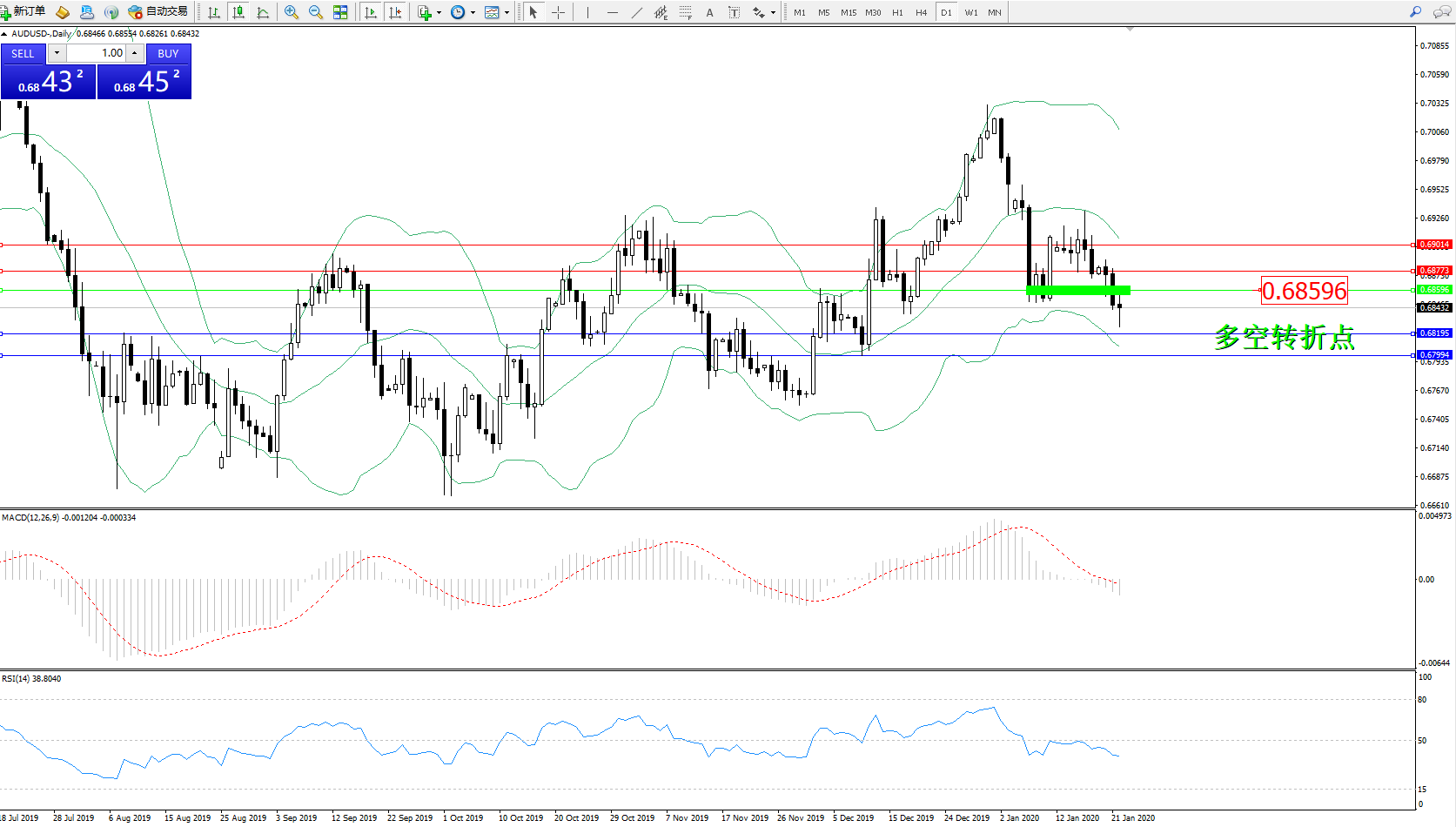 交易策略:0.68596下方看跌,目标0.68195、0.67994