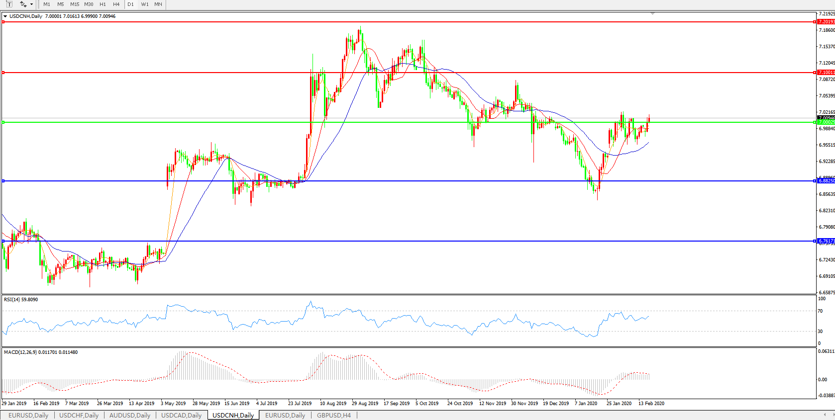 技术面简析:日图均线整体呈多头排列,汇价再度升破7.0关口,MACD运行于0轴上方但量能不足,RSI震荡偏强,预计汇价短期或将围绕7.0关口整理。