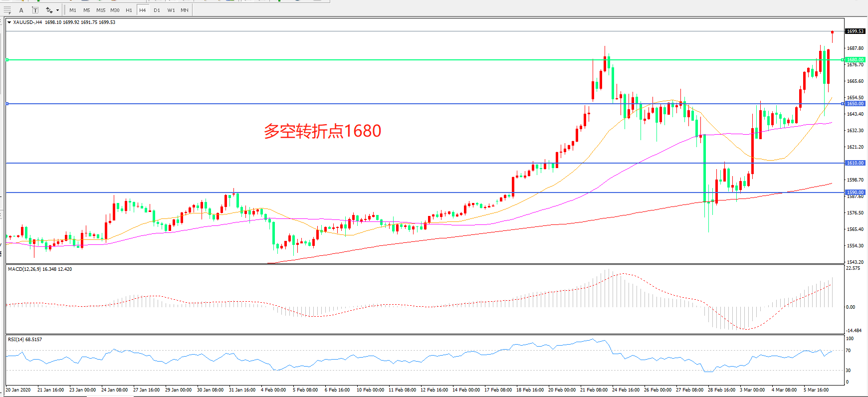 由于OPEC减产谈判破裂,沙特开启“全面油价战争”,周一WTI原油大幅低开近20%,创历史性的低开,这是周末情绪的酝酿,也是沙俄大战的直接体现,这种极端行情推升了市场中的避险情绪,现货黄金跳空高开,截止发稿前收报1699.08美元/盎司,如引发金融市场持续动荡,金价有望进一步上涨。