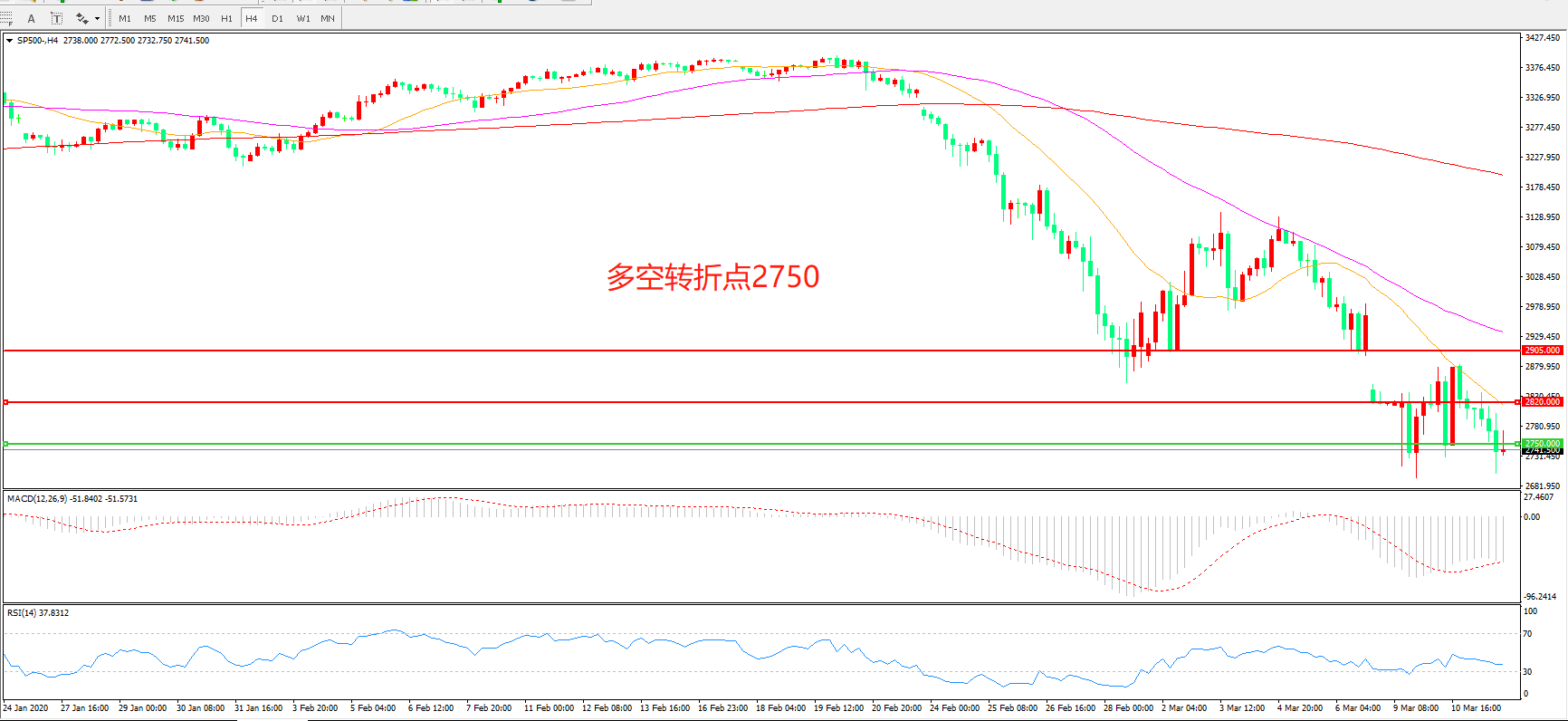 4小时图看,标普500震荡下行,整体表现低迷,2750成为短期支撑,均线系统呈空头排列,MACD绿柱增加,RSI指标走平,中期走势依然偏空。