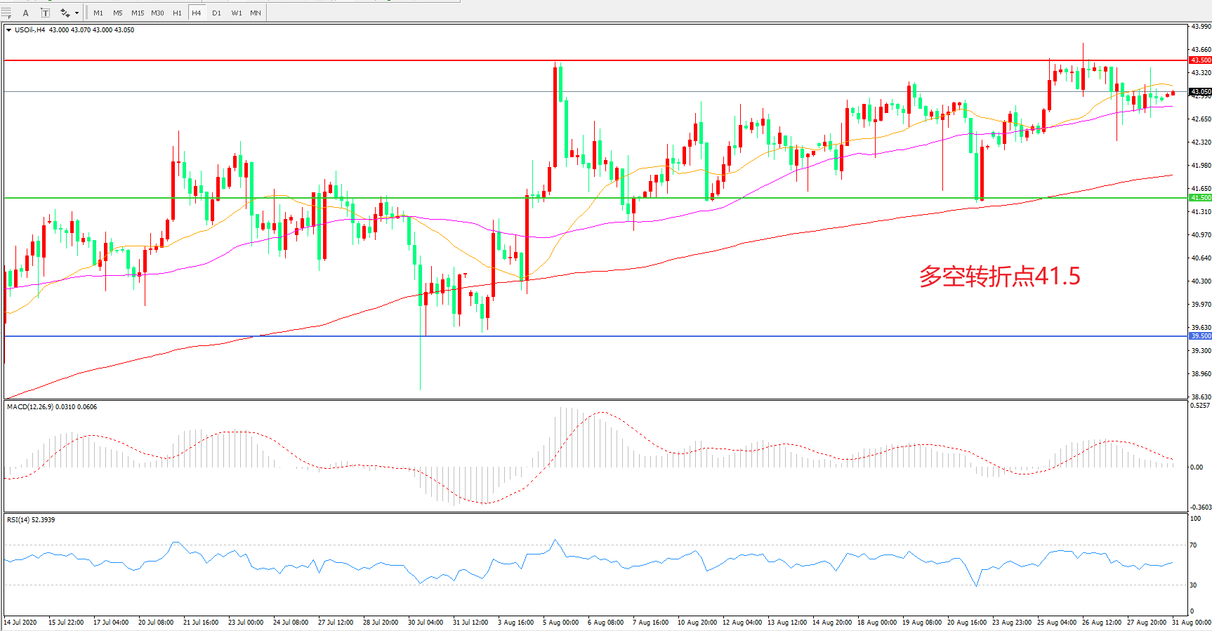 4小时图看,油价触及43.5阻力后出现震荡,整体走势再度陷入分歧,55周期均线成为短期支撑,MACD红柱减少,RSI指标走平,日内延续震荡概率较大。