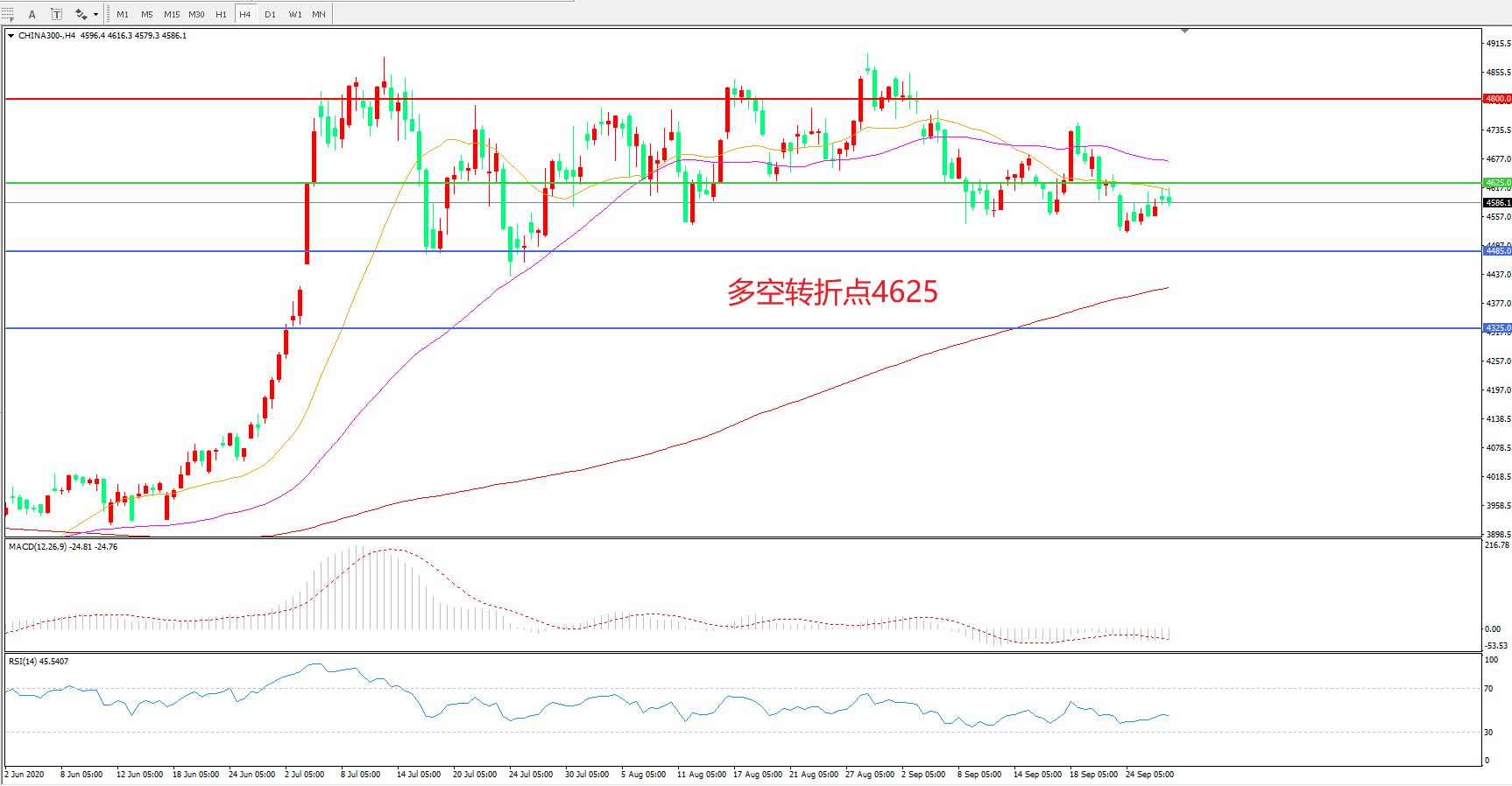 4小时图看,沪深300延续低位震荡,短期方向并不明确,4625成为多空分水岭,均线系统走平, MACD绿柱增加,RSI指标走平,日内延续震荡概率较大。