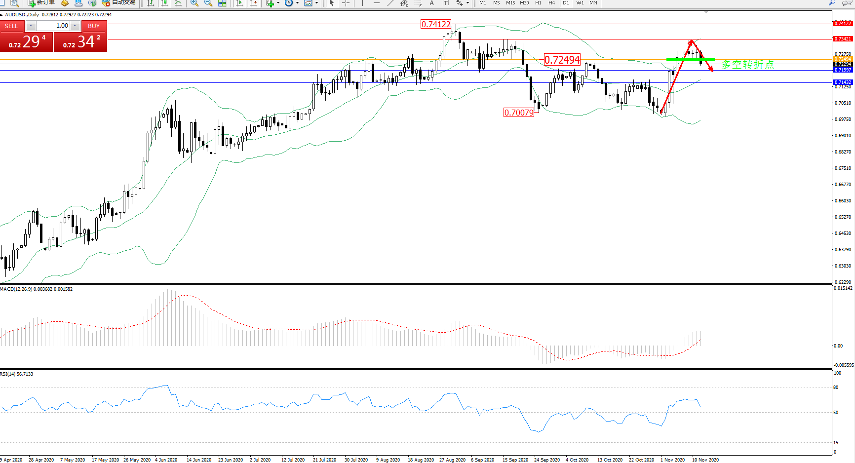 备选策略:0.72494上方看涨,目标0.73421、0.74122