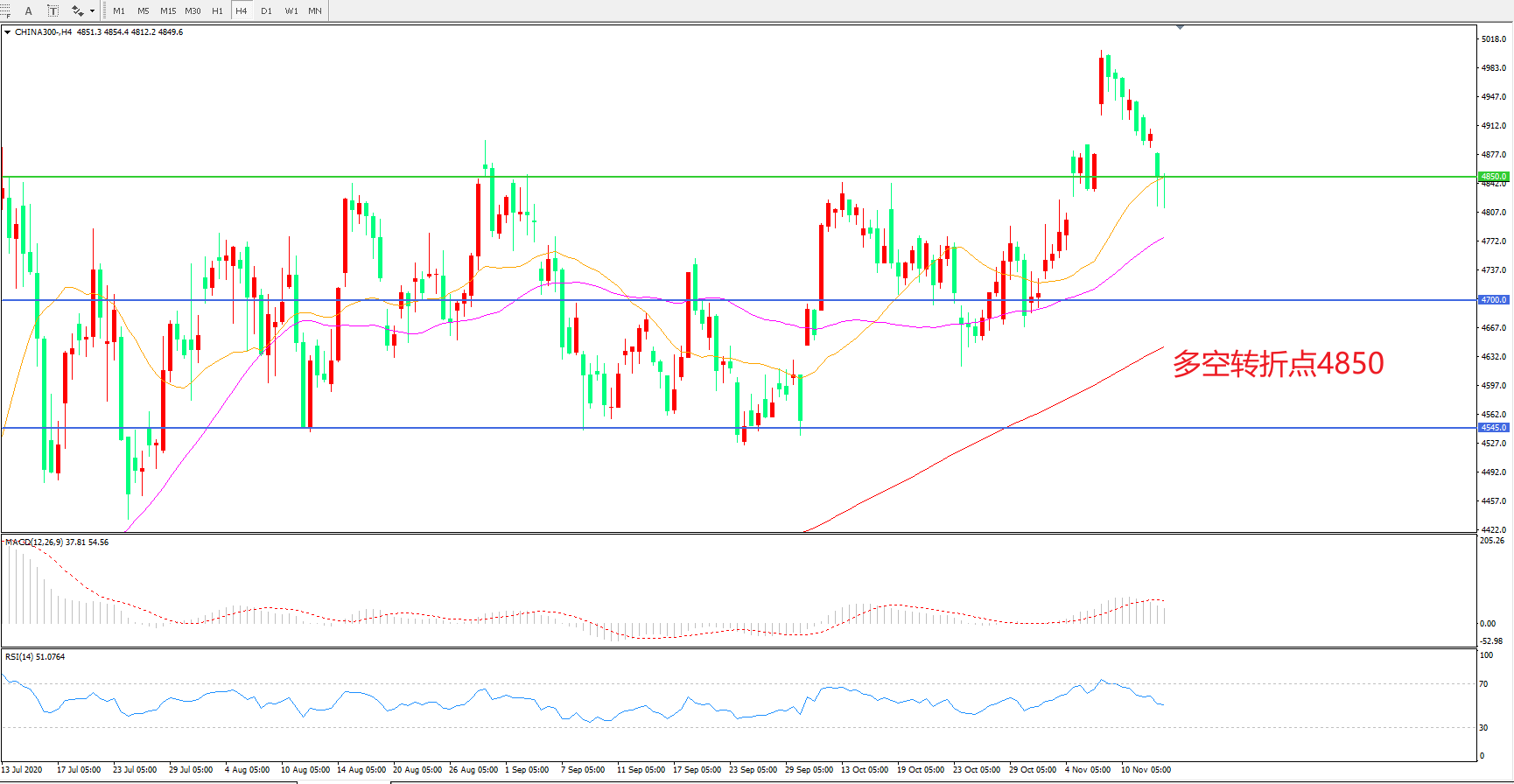 4小时图看,沪深300震荡下行,短期看有回补缺口的迹象,但均线系统依然成多头排列,MACD红柱增加,RSI指标向下,日内延续震荡概率较大。