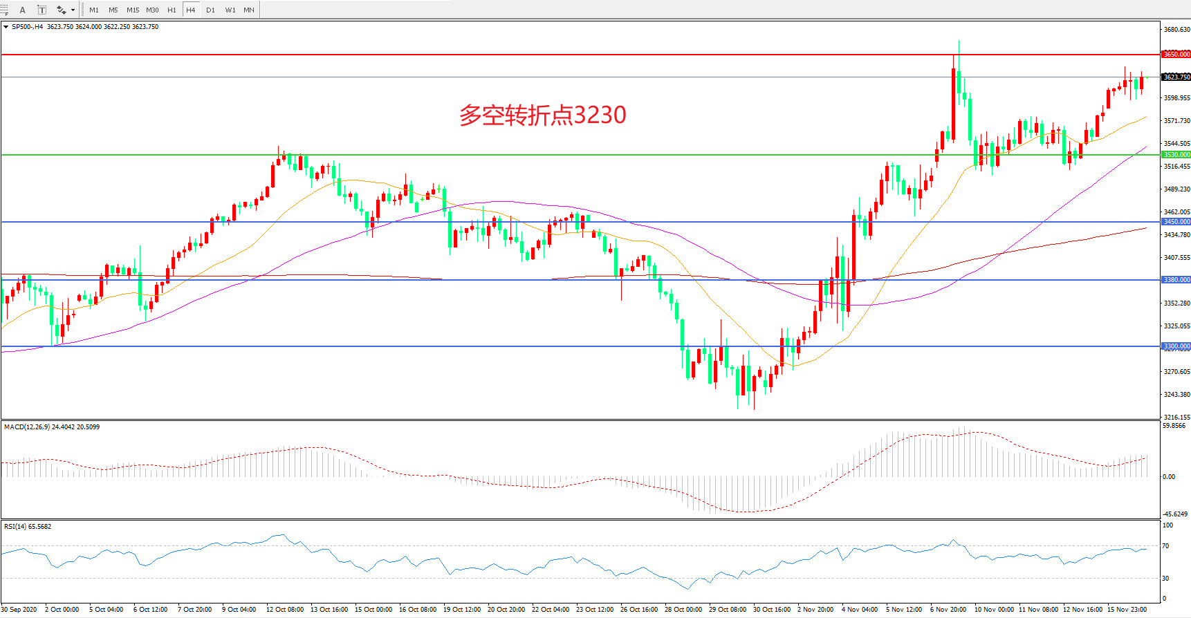 4小时图看,标普500震荡上行,整体表现相对强势,3650成为短期阻力,21周期均线成为下方支撑,MACD红柱增加,RSI指标向上,日内延续上行概率较大。