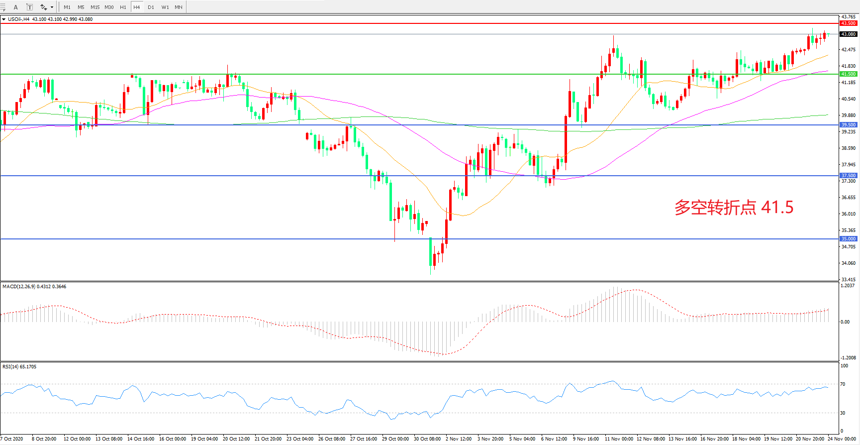 4小时图看,油价延续高位震荡,低点逐渐抬高,短期表现有所回暖,43.5成为短期阻力,21周期均线成为短期支撑,MACD红柱增加,RSI指标走平,日内震荡上行概率较大。