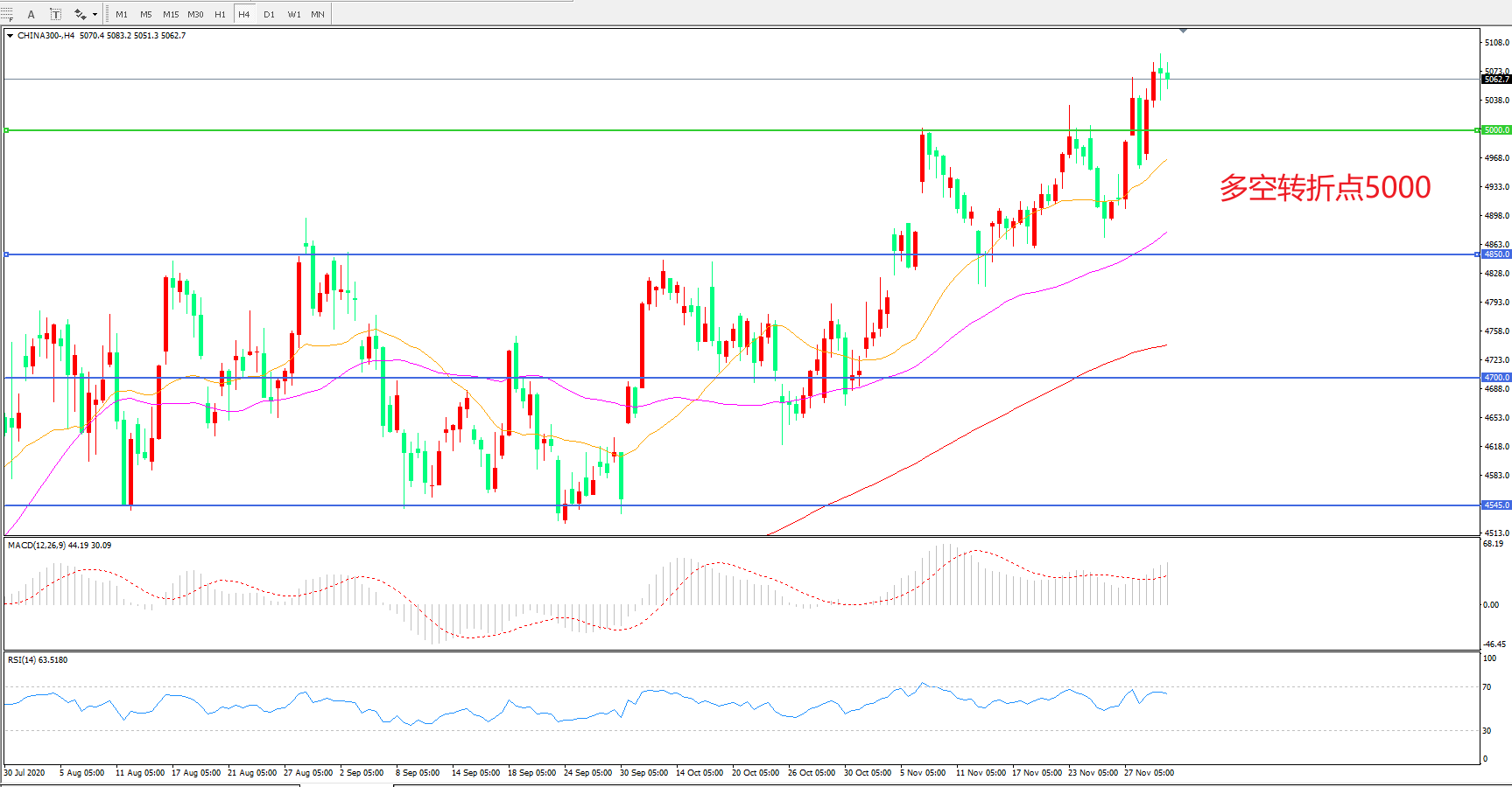 4小时图看,沪深300延续高位震荡,短期走势十分强势,均线系统呈多头排列5000成为下方支撑MACD红柱增加,RSI指标向上,日内延续震荡概率较大。