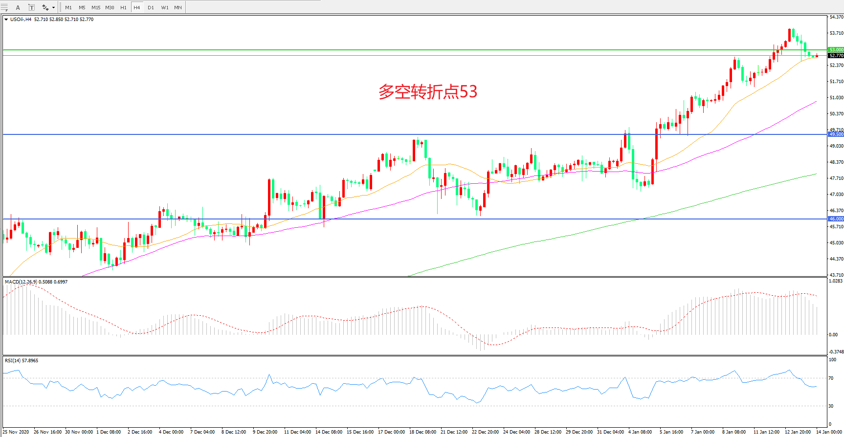 4小时图看,油价连续拉升后小幅回调,但多头形态依然十分明显,21周期均线成为下方支撑,MACD红柱减少,RSI指标走平,日内延续震荡概率较大。