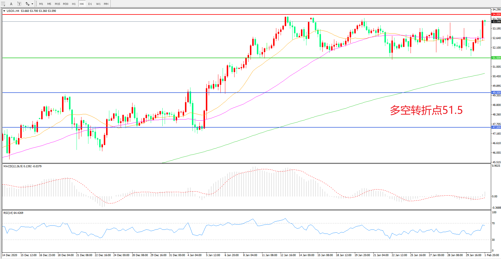 周一(2月1日),原油价格再一次向上试探之后,终于没再出现冲高回落的行情,作为沙特开始自愿超额减产的第一个交易日,多头一鼓作气推升油价,美国WTI原油大幅上行,收报53.65美元/桶。根据据报道称,OPEC一月份的减产执行率为99%,效果还是比较理想。