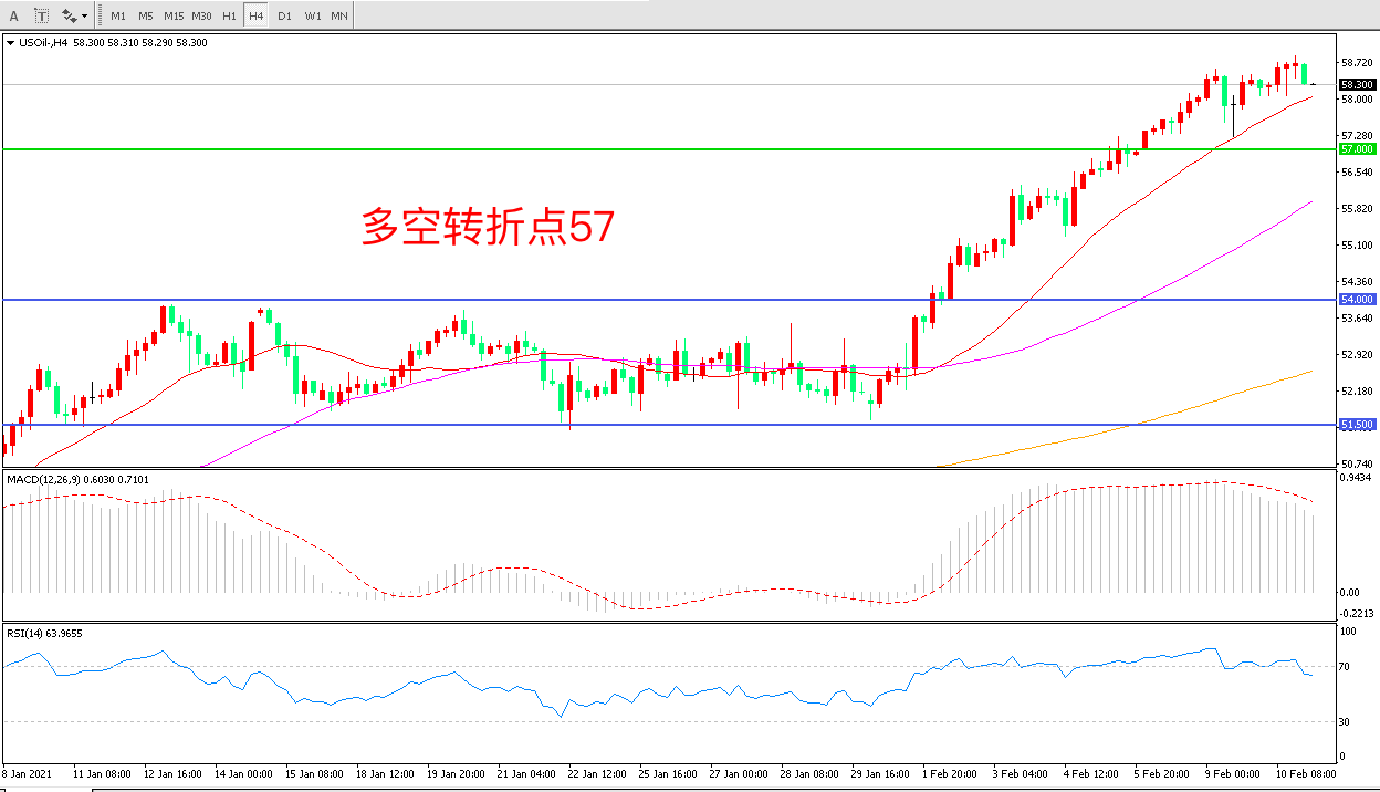 4小时图看,油价连续拉升,整体表现偏强,57阻力被快速突破后,高位震荡迹象明显,MACD红柱缩短,RSI指标走平,日内延续上行概率较大。