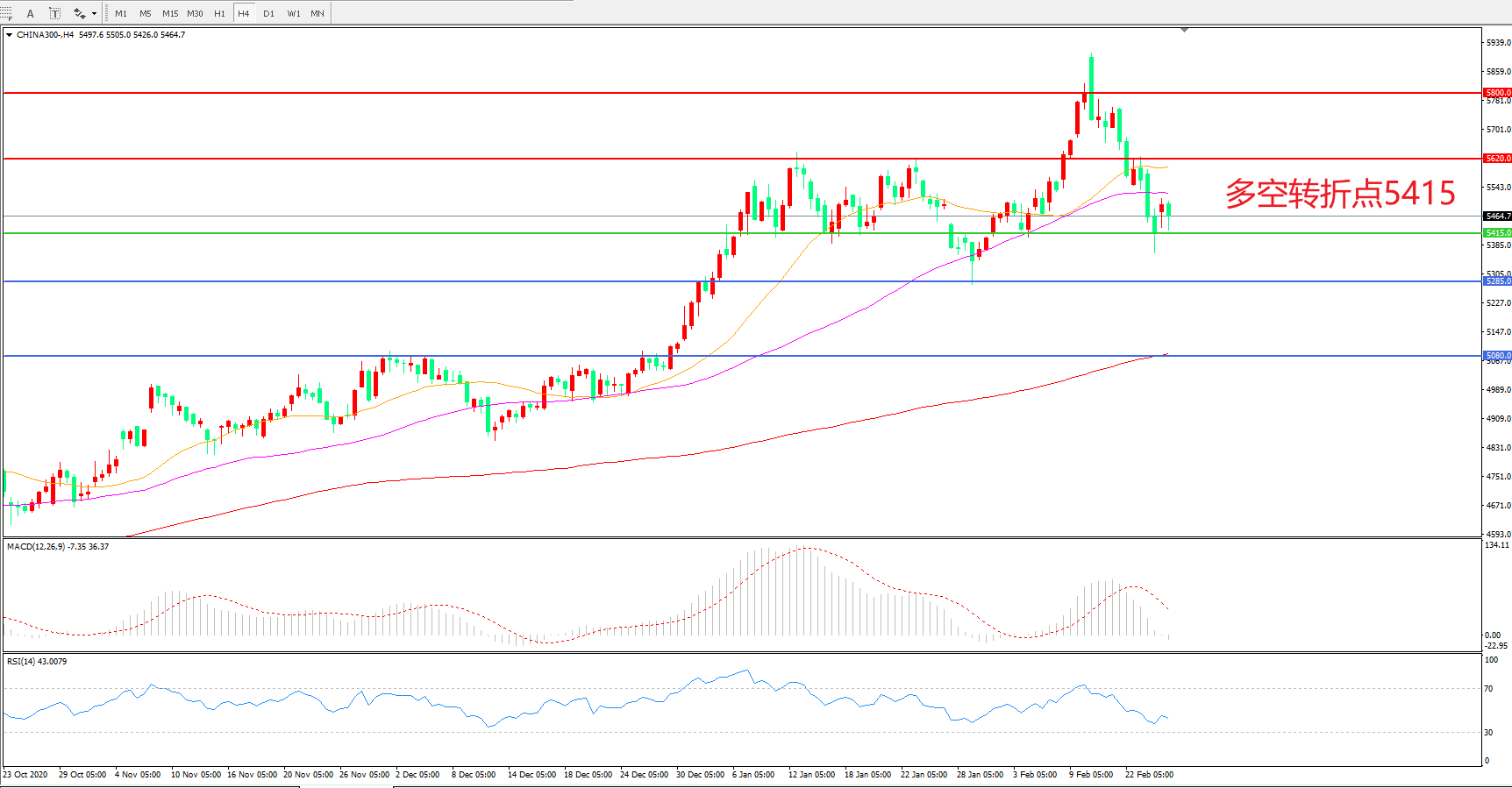 4小时图看,沪深300延续低位窄幅震荡,短期表现相对低迷 ,55周期均线成为上方阻力,5415成为短期支撑,MACD红柱缩短,RSI指标走平,日内延续震荡概率较大。