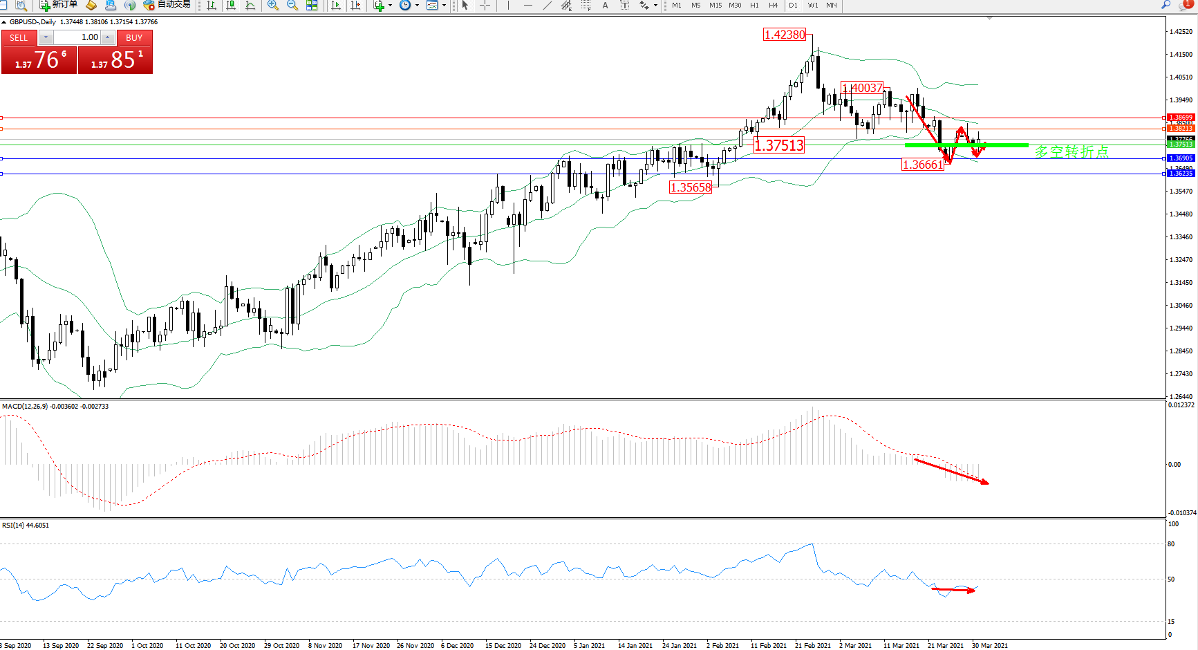 备选策略:1.37513下方看跌,目标1.34905、1.36235