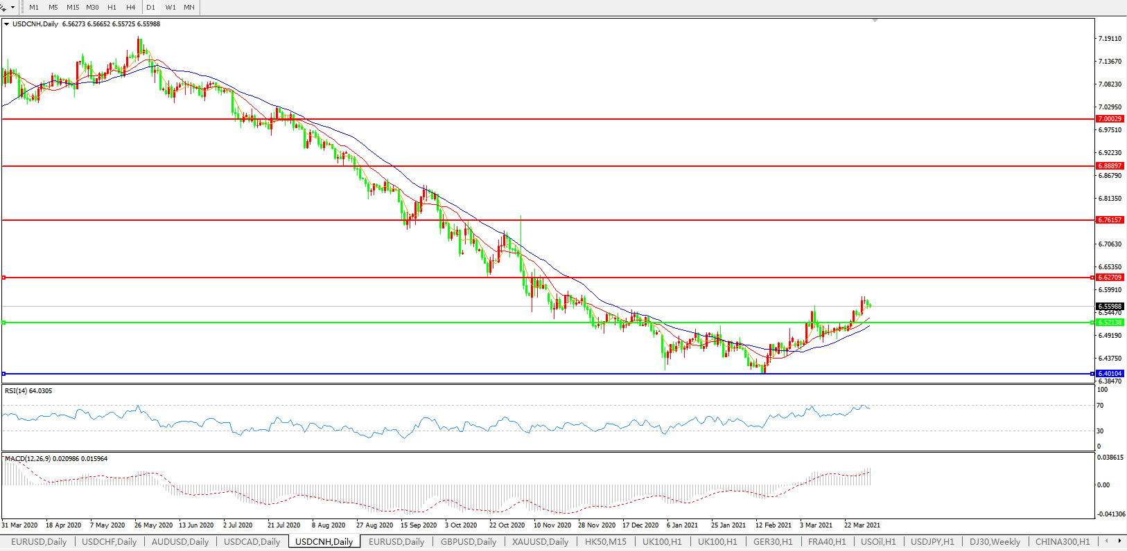 美元兑人民币USDCNH 日线图: