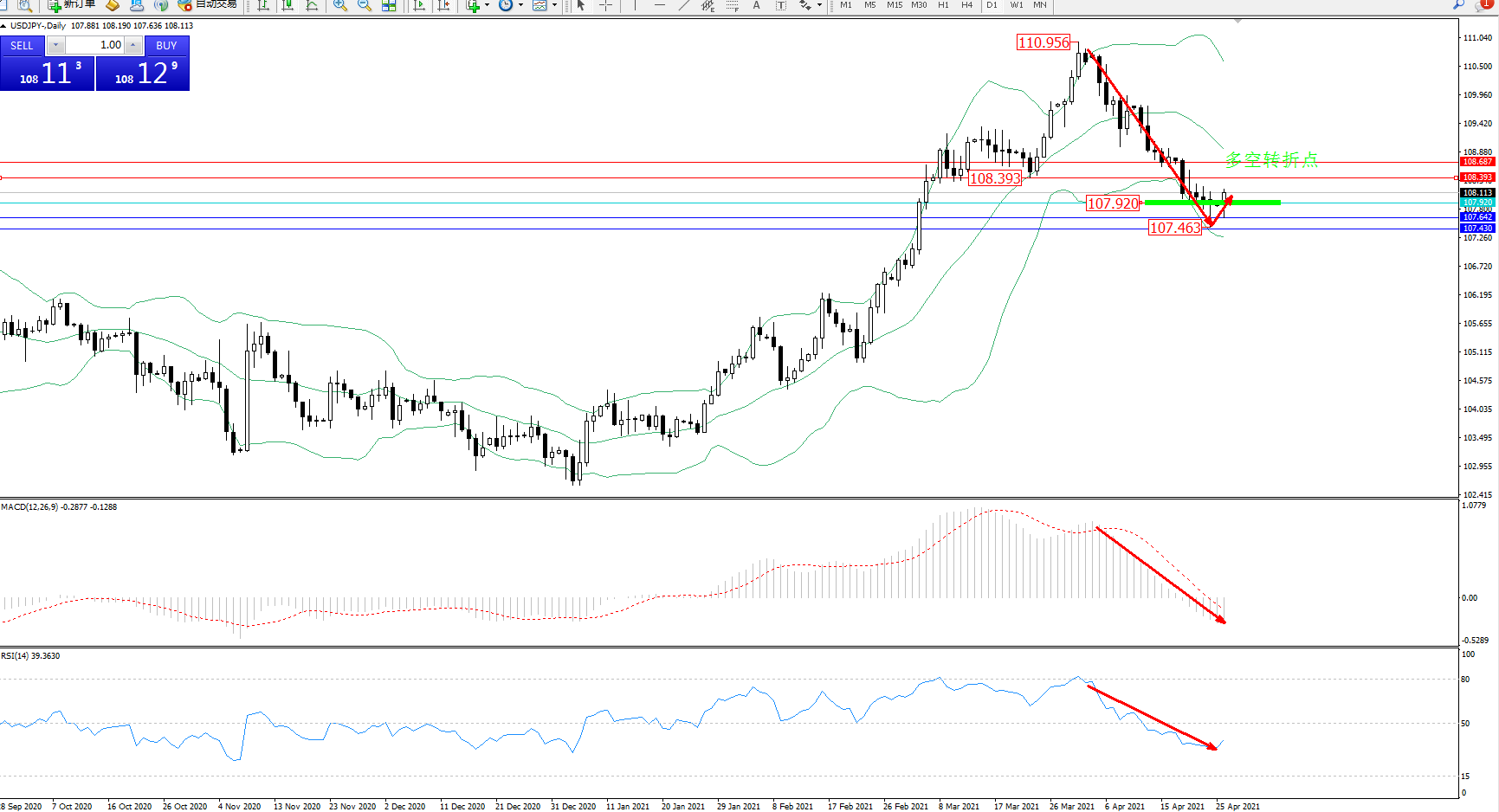 美元兑日圆低位108.113附近震荡,美联储和日本央行本周都将召开政策会议,预计将维持政策不变。投资者将密切关注可能的税收变化和生产成本增加对他们前景的影响。美国企业财报季进入繁忙的一周,美国总统拜登在国会的演说则料包括拟议中提高资本利得税的细节。日本央行料调降通胀预估,并预计到总裁黑田东彦2023年卸任以后,仍将无法达成央行设定的2%通胀目标。日本央行行长黑田东彦及政策委员会将会在为期两天的会议结束后维持当前利率和资产购买政策设置,他们会评估上月政策调整的影响。日本从周日起对东京,大阪和另外两个县宣布进入疫情防控紧急状态,这令央行在季度展望报告中评估经济走向的工作复杂化。