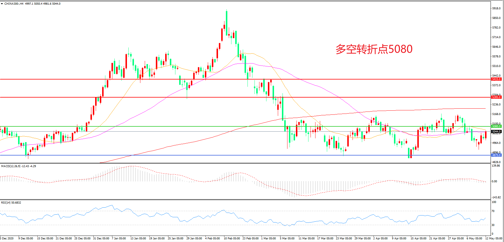 4小时图看,沪深300长阳连续拉升,短期跌势有所缓解,均线系统形成的阻力成为短期多多空分水岭,4875成为下方支撑,MACD红柱缩短,RSI指标向上,日内延续震荡概率较大。