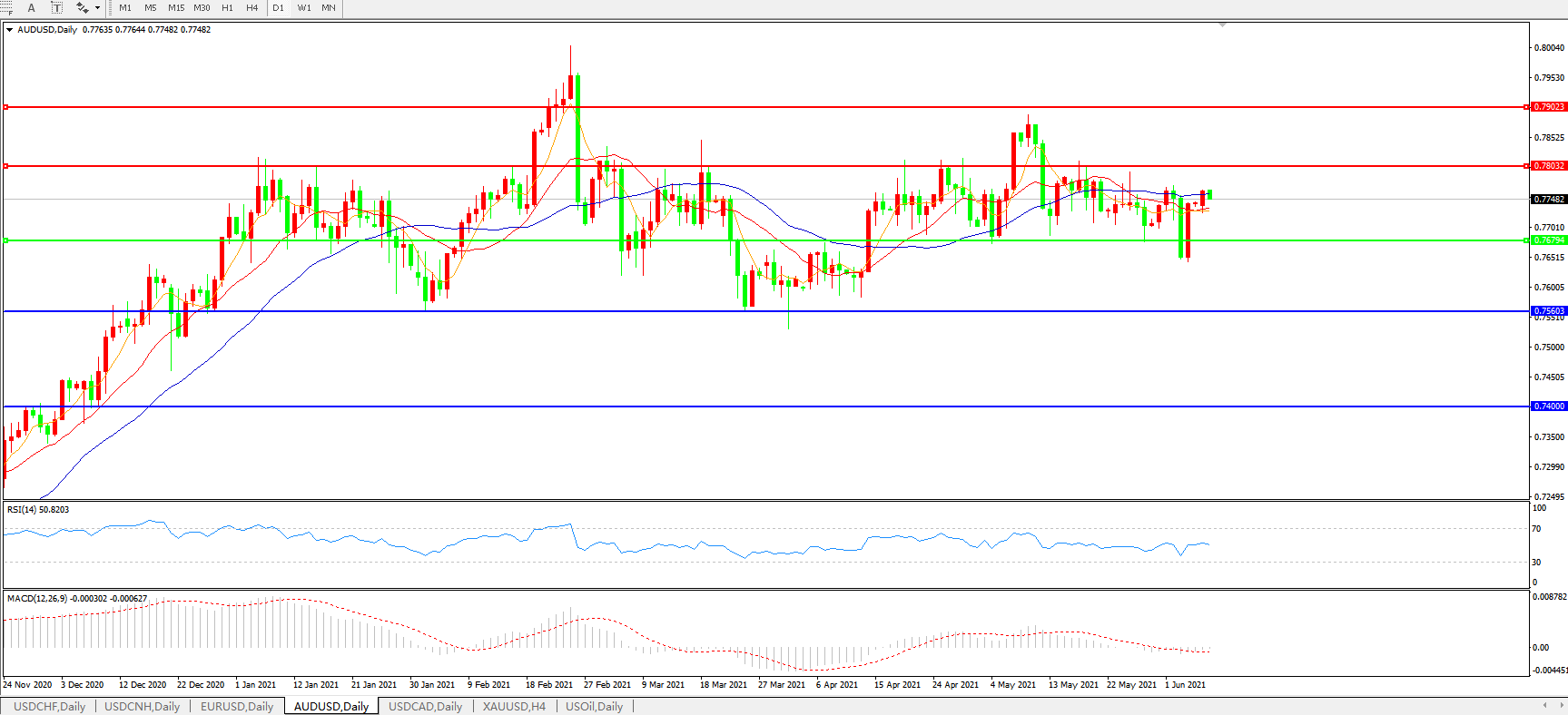 备选策略:0.7680下方看跌,目标0.7560、0.7400