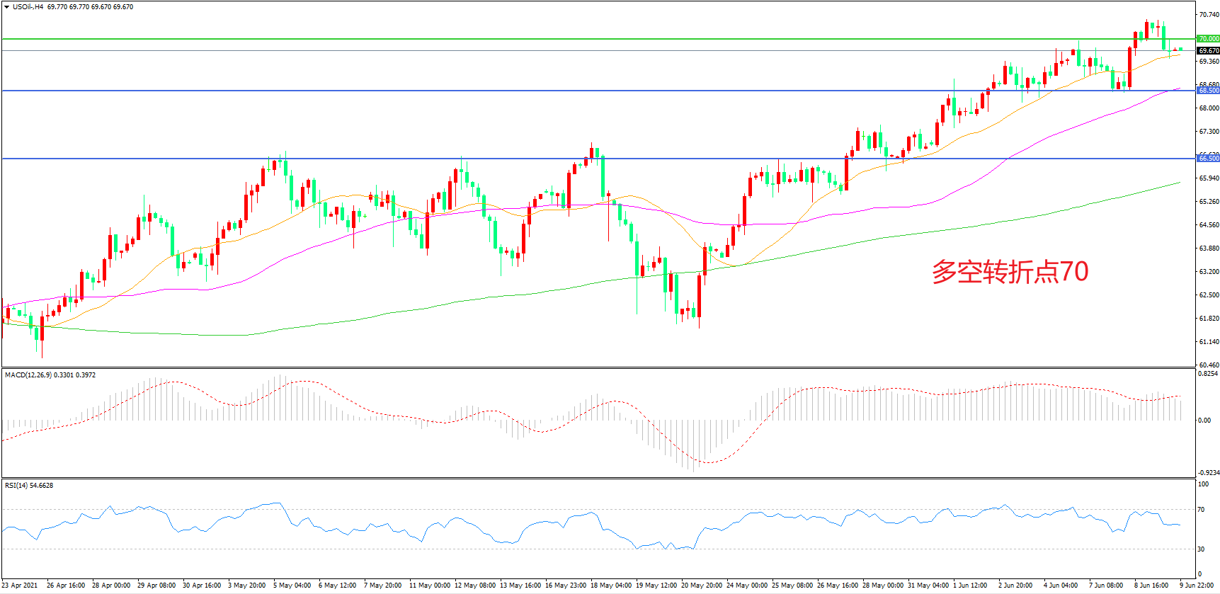 4小时图看,油价整体冲高回落,上行趋势有所放缓,70美元成为短期多空分水岭,均线系统呈多头排列,MACD红柱增加,日内上行概率较大。