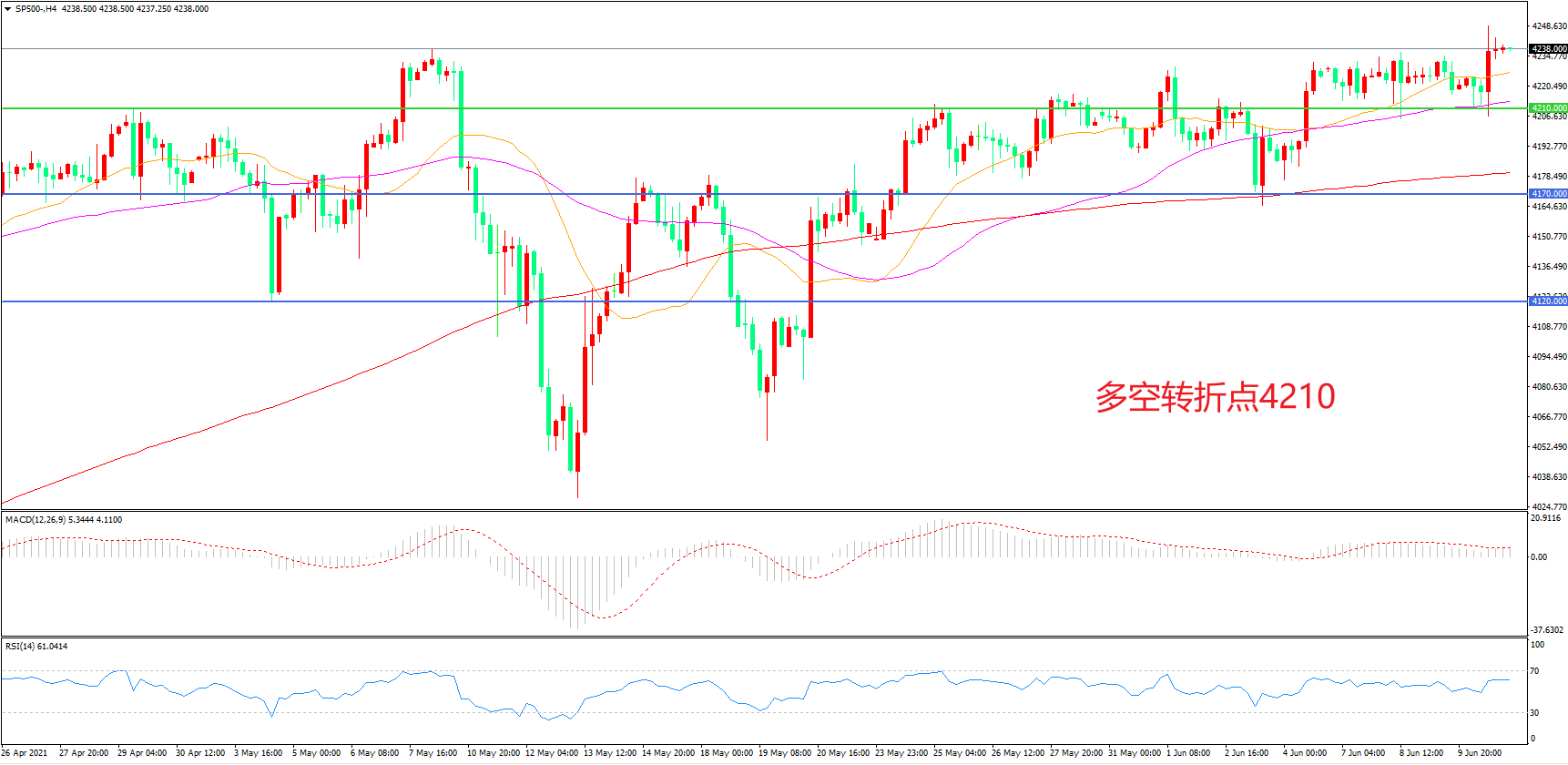 4小时图看,标普500长阳拉升,短期走势有所回暖,均线系统走平,4210成为短期支撑,MACD红柱增加,RSI指标走平,日内震荡上行概率较大。